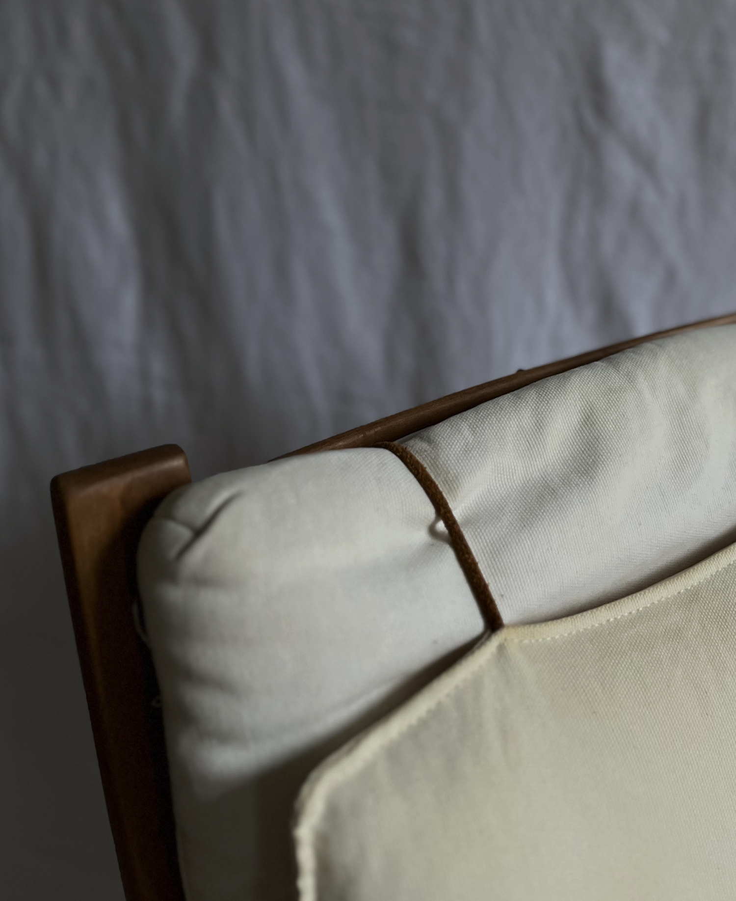 Beautifully curved, packed with attitude and elegance. Soft walnut finish. We adore the crisp lines of this versatile design. Seating cover in good vintage condition, with slight discolorations. Custom upholstery available on-demand.